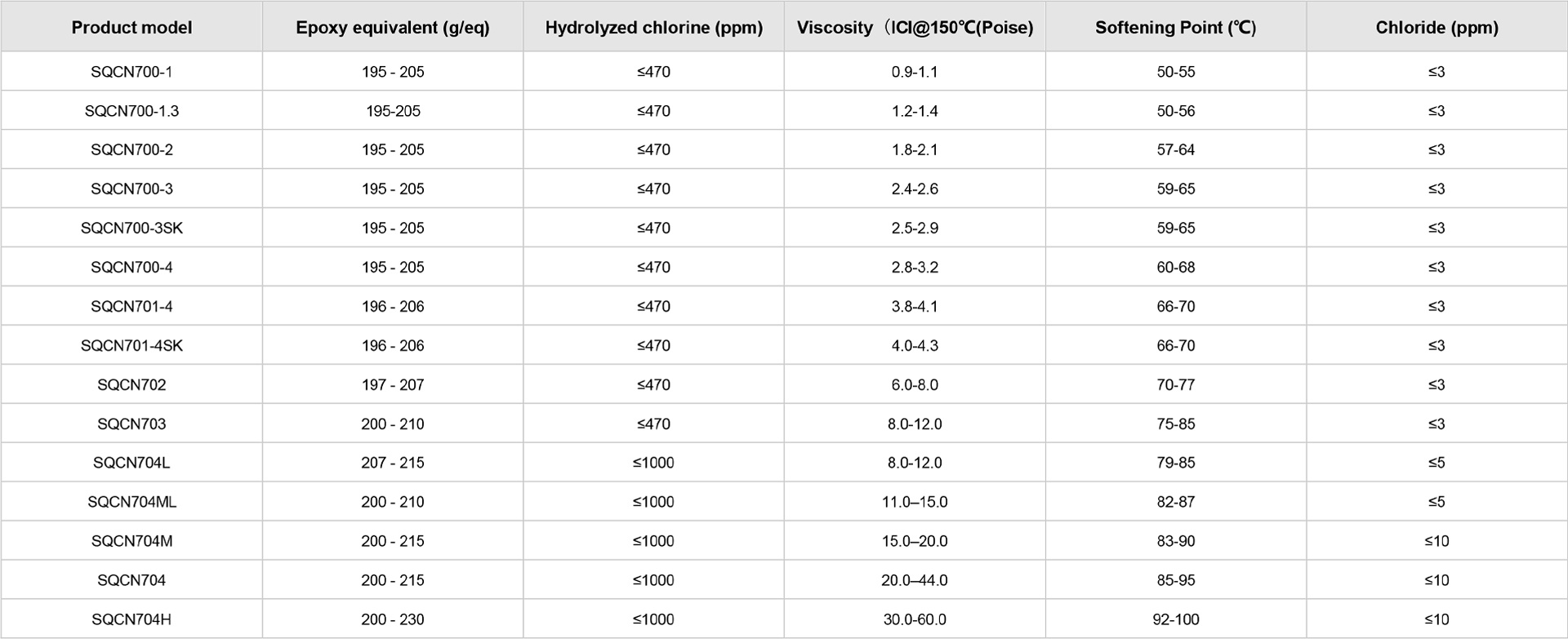 Shengquan® SQCN700 series o-cresol novolac epoxy resin is a multifunctional o-cresol novolac glycidyl ether type epoxy resin. Due to the polyepoxy structure in its molecular structure and the high crosslinking density of the cured product, its cured product Not only has excellent heat resistance, chemical resistance, moisture resistance, but also has excellent electrical insulation and adhesion.