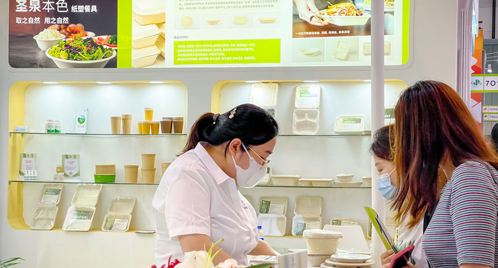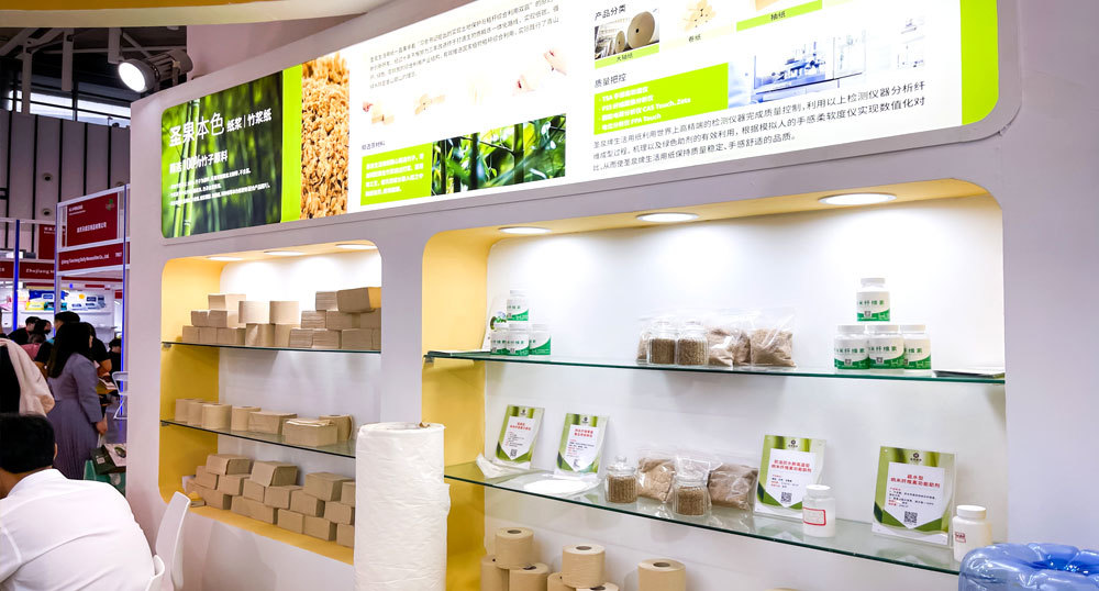 在展覽會(huì)上,聖泉集團展出了紙漿、竹漿紙、可降解紙漿模塑制品、納米纖維素助劑等産品。聖泉集團依托生物質精煉一體化項目,堅持“以草代木”、“以紙代塑”理念,利用農作物稭稈、毛竹、蘆葦等生産生物質紙漿,并進(jìn)一步延伸推出紙漿制品,具有明顯的低碳環保、産業鏈完善等優勢。