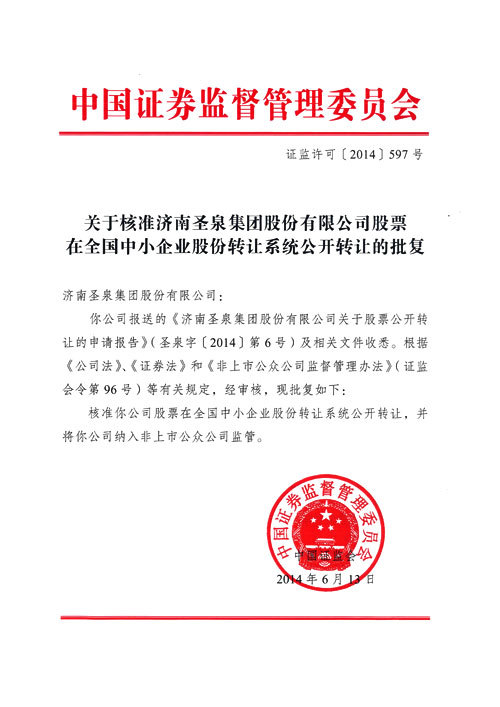 聖泉集團股票在全國(guó)中小企業股份轉讓系統公開(kāi)轉讓獲中國(guó)證券監督管理委員會(huì)核準