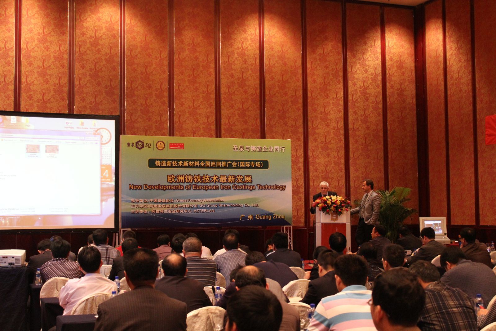聖泉與鑄造企業同行----鑄造新材料新技術全國(guó)巡回推廣會(huì)(廣州站國(guó)際專場)于2011年11月14日在廣州市香格裡(lǐ)拉酒店舉行。會(huì)議邀請了聖泉戰略合作夥伴——歐洲阿茲特蘭冶金研究所的鑄造專家Gorka Zarrabeitia 和Ramón Suárez先生,就(jiù)歐洲鑄鐵技術的最新發(fā)展作了6個精彩報告,報告内容包括:歐洲最新球化處理技術、雙聯熔煉技術、獲得全部細小A型石墨的技術方法、大型球鐵件關鍵控制技術、汽車鑄鐵件的生産與控制以及智能(néng)化鐵水分析系統。