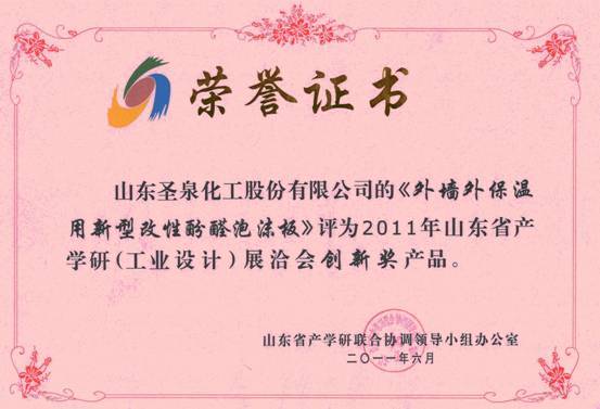 在近期舉辦的2011年山東省産學(xué)研展洽會(huì)上,公司《外牆外保溫用新型改性酚醛泡沫闆》以國(guó)際領先的卓越品質,被評爲2011年山東省産學(xué)研(工業設計)展洽會(huì)創新獎産品。