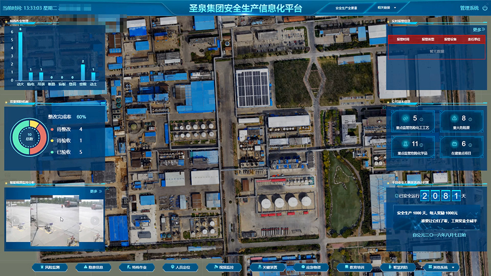 安全發(fā)展,投入是保障。2000天裡(lǐ),聖泉集團累計投入6000餘萬元對(duì)一線技術改造提升,著(zhe)力提高自動化程度和應急處置能(néng)力;加強安全管理智能(néng)化和數字化水平,倉儲系統火災風險實現無人化識别和自動撲救,切實提高安全管理環節的智能(néng)化水平;風險監測預警平台實時(shí)監測重大危險源感知數據,有效防範重特大生産安全事(shì)故;移動視頻監控系統,覆蓋特殊作業全過(guò)程,強化特殊作業監督管理力度…