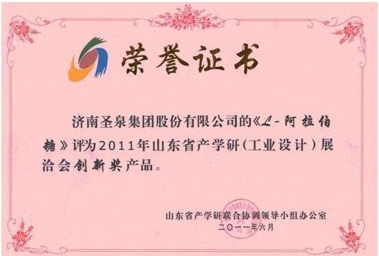 在近期舉辦的2011年山東省産學(xué)研展洽會(huì)上,公司《L-阿拉伯糖》以國(guó)際領先的卓越品質,被評爲2011年山東省産學(xué)研(工業設計)展洽會(huì)創新獎産品。