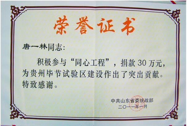 近日,省委統戰部授予唐和唐董事(shì)長(cháng)唐一林支援貴州畢節實驗區建設榮譽證書,對(duì)他積極響應中央統戰部及省委統戰部号召,參與“同心工程”,援助貴州畢節實驗區建設所作出的努力給予表彰鼓勵。