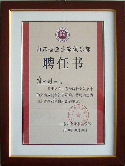 唐總被聘爲山東企業家俱樂部副主席證書