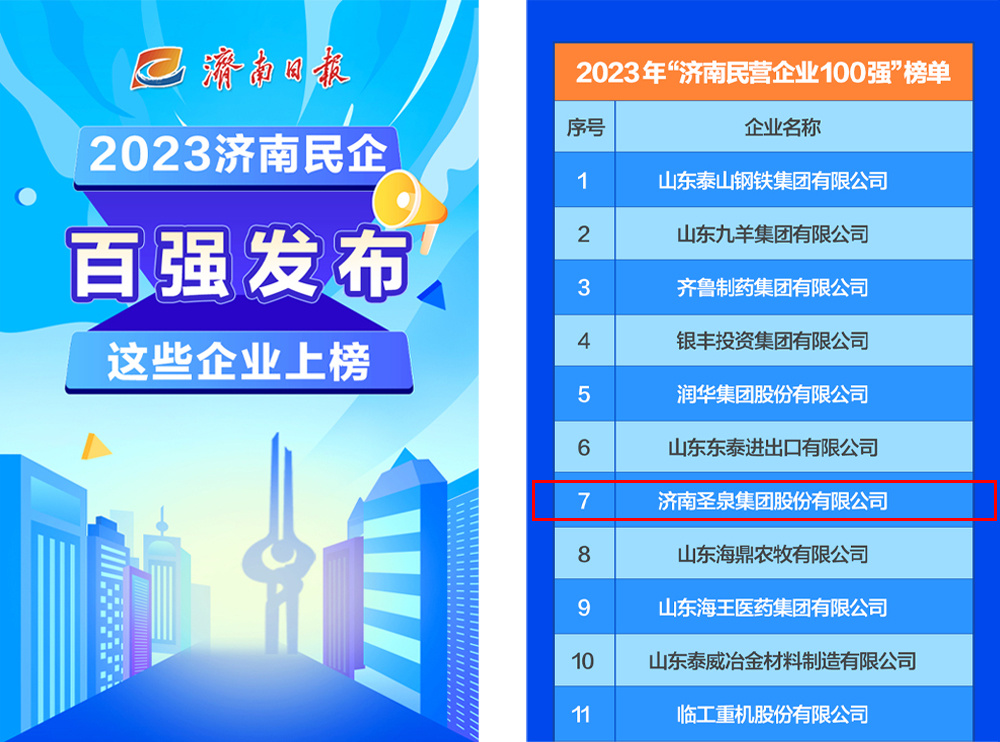 10月10日,濟南市委市政府召開(kāi)新聞發(fā)布會(huì),在會(huì)上發(fā)布2023年“濟南民營企業100強”系列榜單。濟南聖泉集團股份有限公司再次入選2023年“濟南民營企業100強”榜單,位列第七位。
