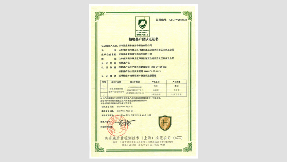 近日,濟南聖泉唐和唐生物科技有限公司旗下産品木糖醇、L-阿拉伯糖、木糖獲植物基産品認證。聖泉唐和唐是國(guó)内重要的稀有糖生産商,將(jiāng)農作物稭稈作爲其産品制備的關鍵原料,應用現代生物提取技術爲用戶提供系列稀有糖及衍生物産品,産品天然純淨,生産加工過(guò)程中不涉及任何動物來源的配料污染。