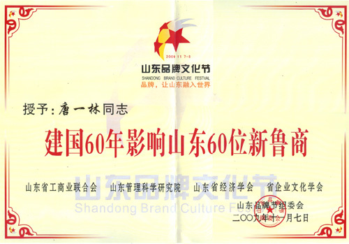 唐和唐董事(shì)長(cháng)唐一林被評爲“建國(guó)60周年影響山東60位新魯商”
